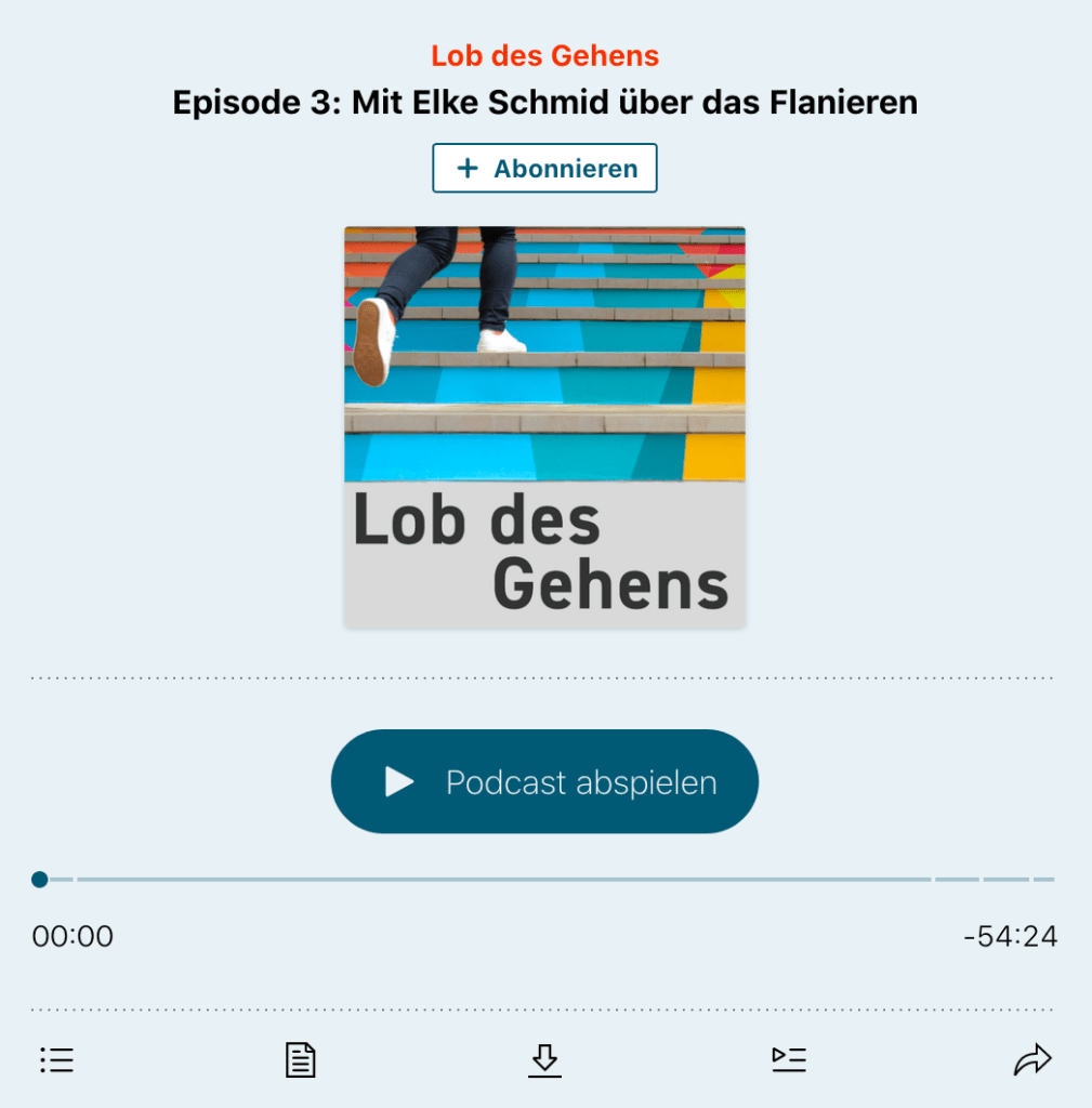 In diesem Geiste sprach kürzlich Elke Schmid, Mitgründerin der ÉCOLEFLÂNEURS, mit der Hamburger Podcasterin Nicola Wessinghage für ihren Podcast „Lob des Gehens“, den wir hiermit allen in jeglicher Hinsicht Bewegungsfreudigen ans Herz legen.